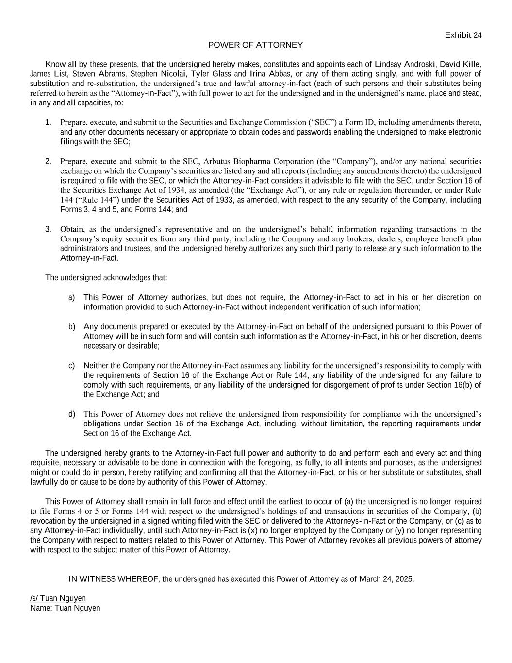 Exhibit 24 POWER OF ATTORNEY Know all by these presents, that the undersigned hereby makes, constitutes and appoints each of Lindsay Androski, David Kille, James List, Steven Abrams, Stephen Nicolai, Tyler Glass and Irina Abbas, or any of them acting singly, and with full power of substitution and re-substitution, the undersigned’s true and lawful attorney-in-fact (each of such persons and their substitutes being referred to herein as the “Attorney-in-Fact”), with full power to act for the undersigned and in the undersigned’s name, place and stead, in any and all capacities, to: 1. Prepare, execute, and submit to the Securities and Exchange Commission (“SEC”) a Form ID, including amendments thereto, and any other documents necessary or appropriate to obtain codes and passwords enabling the undersigned to make electronic filings with the SEC; 2. Prepare, execute and submit to the SEC, Arbutus Biopharma Corporation (the “Company”), and/or any national securities exchange on which the Company’s securities are listed any and all reports (including any amendments thereto) the undersigned is required to file with the SEC, or which the Attorney-in-Fact considers it advisable to file with the SEC, under Section 16 of the Securities Exchange Act of 1934, as amended (the “Exchange Act”), or any rule or regulation thereunder, or under Rule 144 (“Rule 144”) under the Securities Act of 1933, as amended, with respect to the any security of the Company, including Forms 3, 4 and 5, and Forms 144; and 3. Obtain, as the undersigned’s representative and on the undersigned’s behalf, information regarding transactions in the Company’s equity securities from any third party, including the Company and any brokers, dealers, employee benefit plan administrators and trustees, and the undersigned hereby authorizes any such third party to release any such information to the Attorney-in-Fact. The undersigned acknowledges that: a) This Power of Attorney authorizes, but does not require, the Attorney-in-Fact to act in his or her discretion on information provided to such Attorney-in-Fact without independent verification of such information; b) Any documents prepared or executed by the Attorney-in-Fact on behalf of the undersigned pursuant to this Power of Attorney will be in such form and will contain such information as the Attorney-in-Fact, in his or her discretion, deems necessary or desirable; c) Neither the Company nor the Attorney-in-Fact assumes any liability for the undersigned’s responsibility to comply with the requirements of Section 16 of the Exchange Act or Rule 144, any liability of the undersigned for any failure to comply with such requirements, or any liability of the undersigned for disgorgement of profits under Section 16(b) of the Exchange Act; and d) This Power of Attorney does not relieve the undersigned from responsibility for compliance with the undersigned’s obligations under Section 16 of the Exchange Act, including, without limitation, the reporting requirements under Section 16 of the Exchange Act. The undersigned hereby grants to the Attorney-in-Fact full power and authority to do and perform each and every act and thing requisite, necessary or advisable to be done in connection with the foregoing, as fully, to all intents and purposes, as the undersigned might or could do in person, hereby ratifying and confirming all that the Attorney-in-Fact, or his or her substitute or substitutes, shall lawfully do or cause to be done by authority of this Power of Attorney. This Power of Attorney shall remain in full force and effect until the earliest to occur of (a) the undersigned is no longer required to file Forms 4 or 5 or Forms 144 with respect to the undersigned’s holdings of and transactions in securities of the Company, (b) revocation by the undersigned in a signed writing filed with the SEC or delivered to the Attorneys-in-Fact or the Company, or (c) as to any Attorney-in-Fact individually, until such Attorney-in-Fact is (x) no longer employed by the Company or (y) no longer representing the Company with respect to matters related to this Power of Attorney. This Power of Attorney revokes all previous powers of attorney with respect to the subject matter of this Power of Attorney. IN WITNESS WHEREOF, the undersigned has executed this Power of Attorney as of March 24, 2025. /s/ Tuan Nguyen Name: Tuan Nguyen